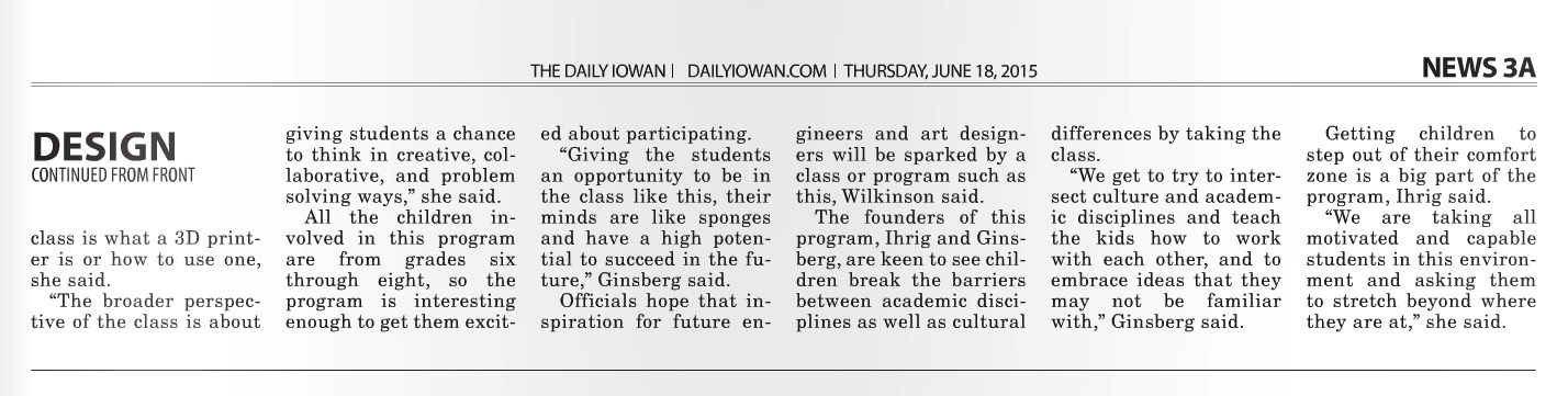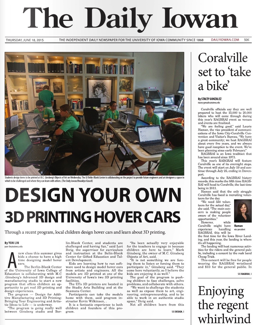 [Source: “Design Your Own 3D Printing Hover Cars — Through a recent program, local children design hover cars and learn about 3D printing,” Daily Iowan, 18 June 2015, by Yun Lin]
